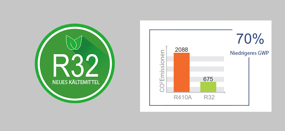 Die Delta Serie nutzt das neue grüne und äußerst umweltfreundliche Kältemittel R32. Mit einem GWP von 675 ist es gegenüber dem oft gebräuchlichen Kältemittel R410a nicht nur rund 70% weniger Umweltschädlich sondern auch effizienter.